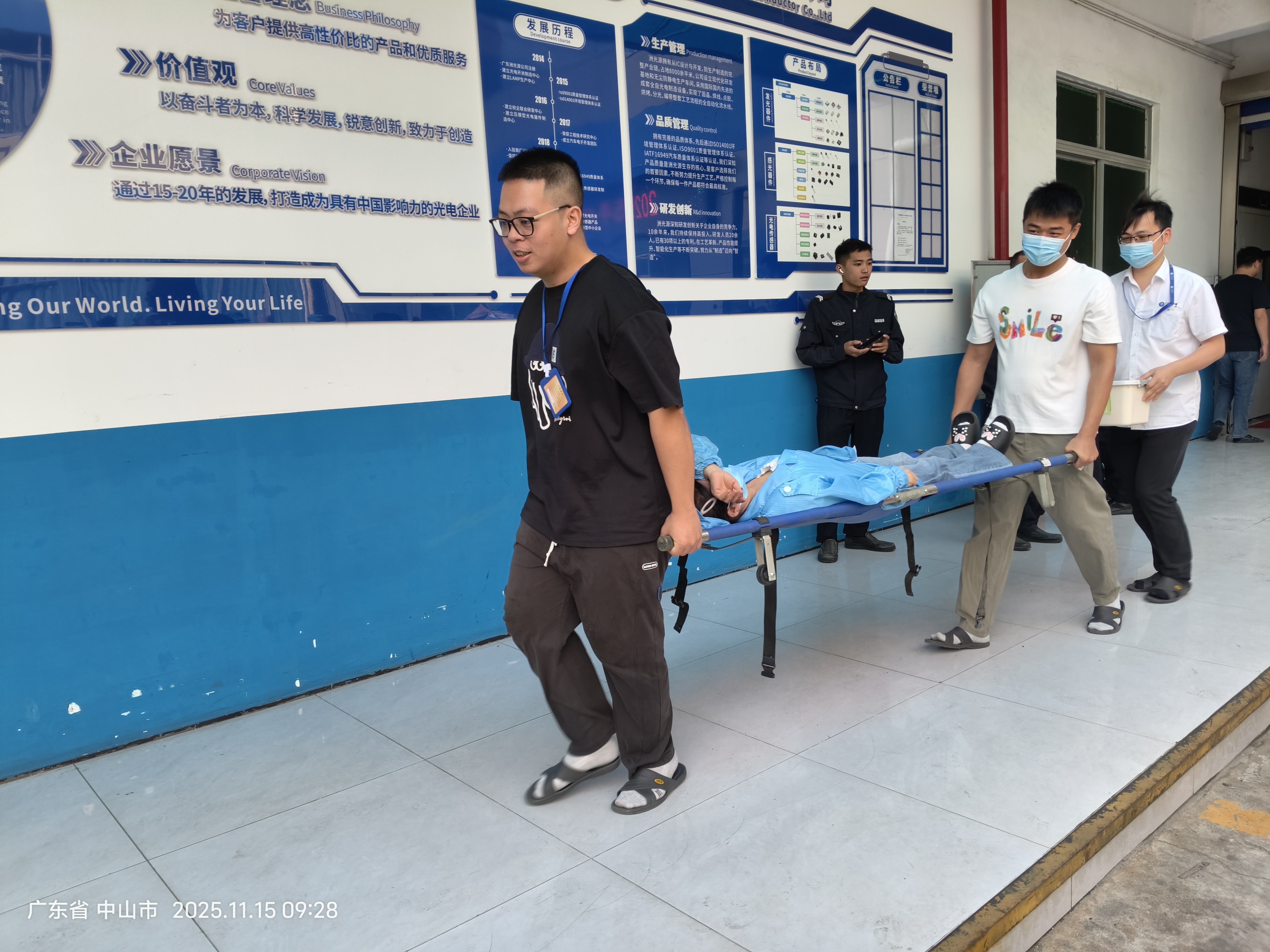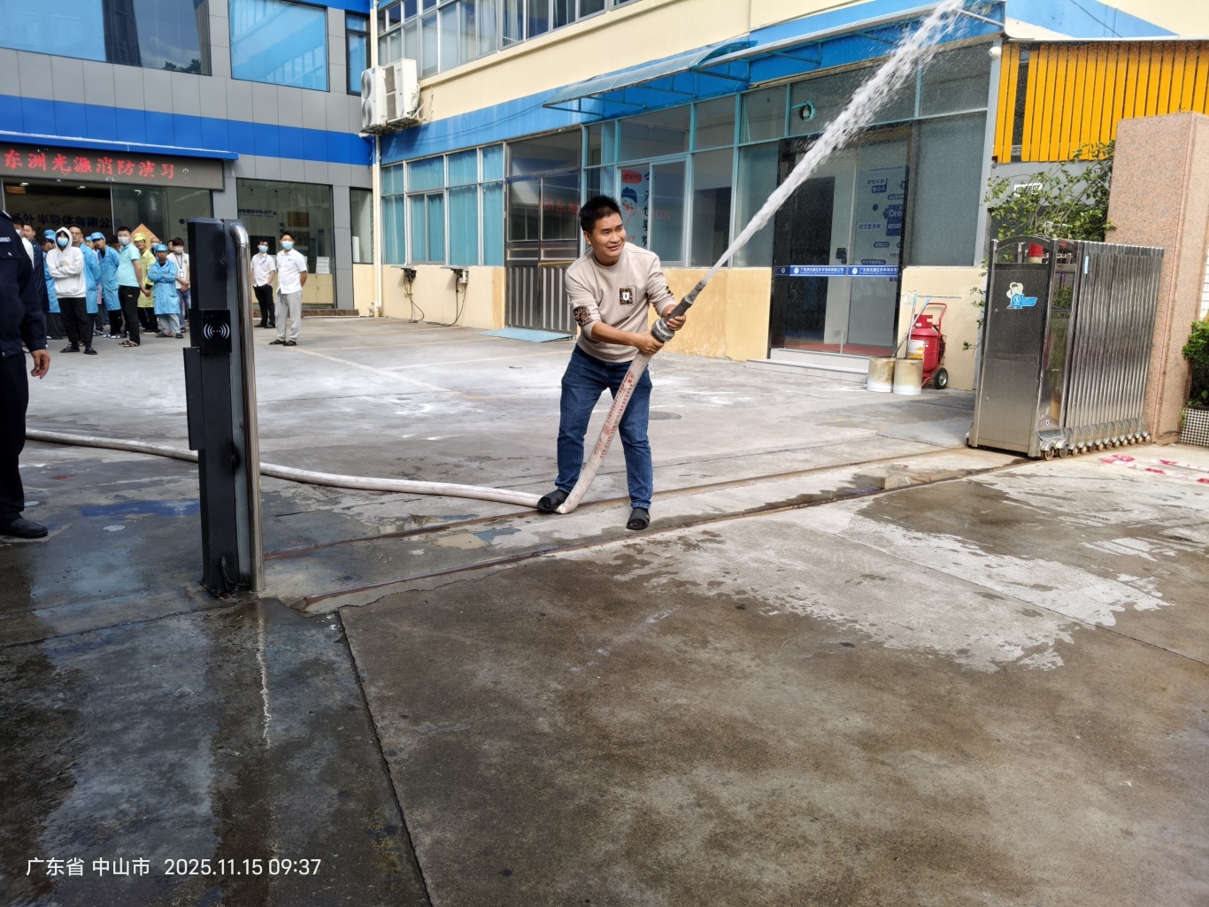 演练现场以 “模拟真实火情” 为核心,通过多环节衔接,全面检验企业应急响应与员工实战能力,模拟情景:2025 年 11 月 15 日 9 时,洲光源员工涂针针发现火情立即拨打 119 报警,万龙英向应急指挥中心报告,总指挥刘峰斌启动应急预案,各岗位待命并切断总电源,疏散组按分工引导员工低姿捂口鼻,从指定楼梯疏散至厂大门指定区域,警戒组在火场附近拉警戒线,灭火组取灭火器灭火、铺消防水带,抢救组救助脚伤人员,疏散后集合清点人数,确认火灭且无伤亡,总指挥宣布解除紧急状态。