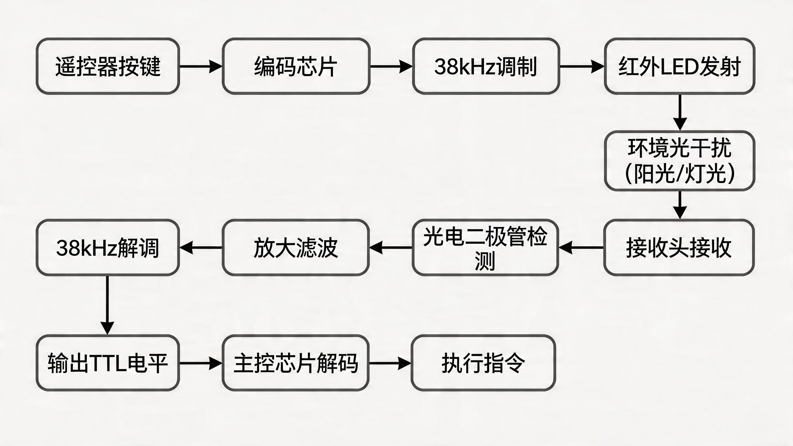带通滤波:内置带通滤波器仅允许特定载波频率(常见为38kHz、36kHz、56kHz等)的信号通过,有效滤除环境光干扰。
