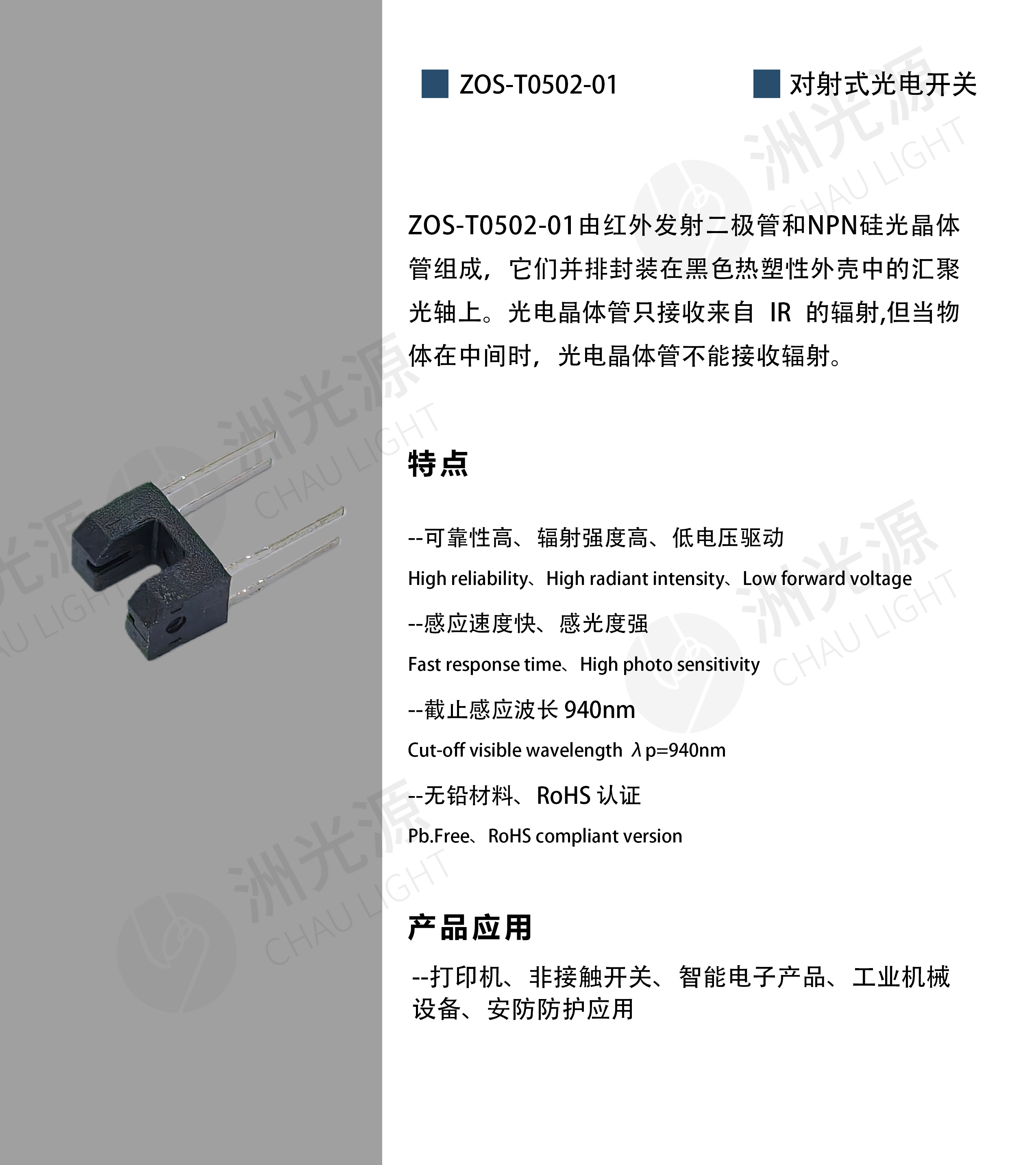 ZOS-T0502-01由红外发射二极管和NPN硅光晶体管组成,它们并排封装在黑色热塑性外壳中的汇聚光轴上。光电晶体管只接收来自IR的辐射,但当物体在中间时,光电晶体管不能接收辐射。
