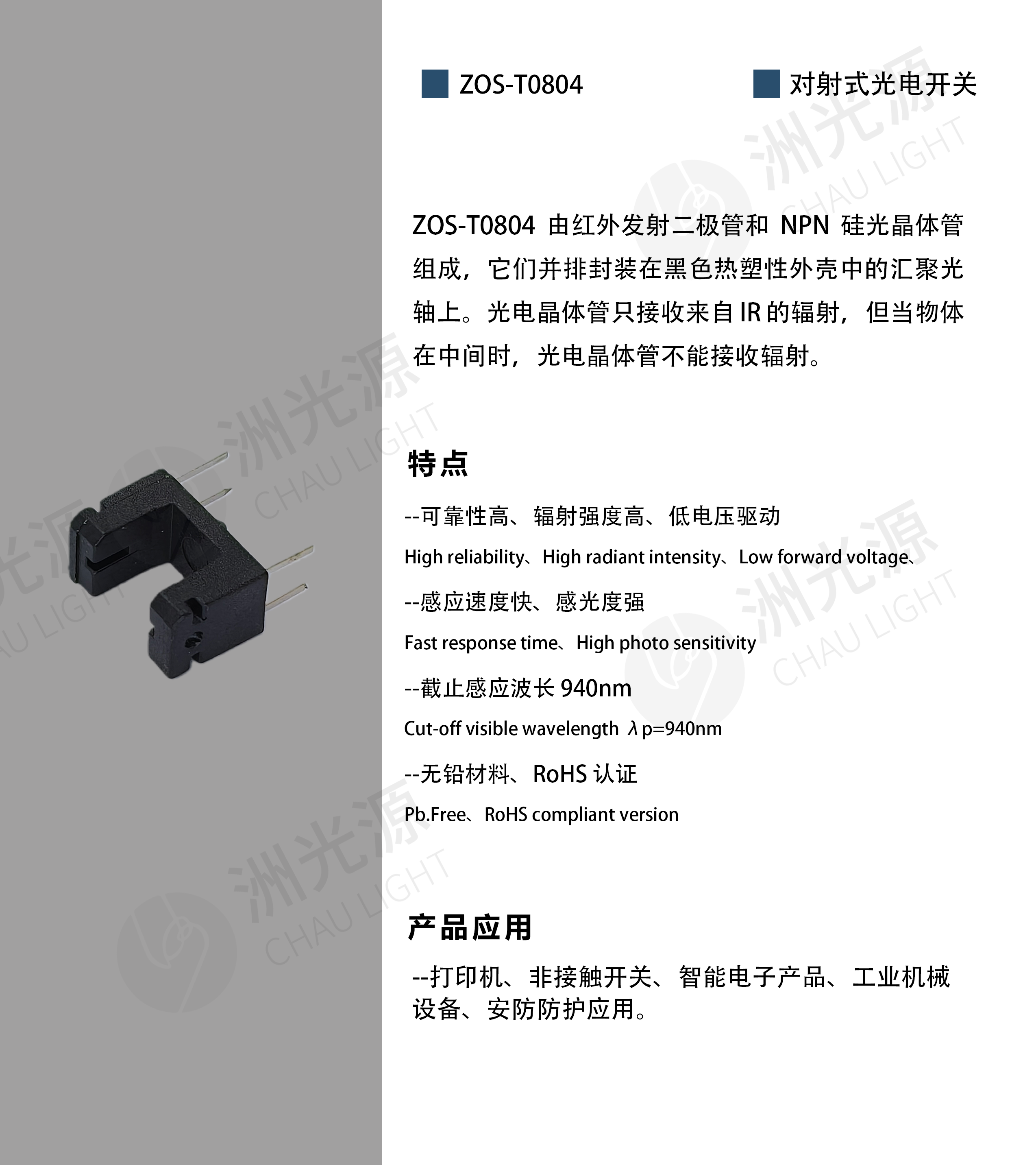 ZOS-T0804由红外发射二极管和NPN硅光晶体管组成,它们并排封装在黑色热塑性外壳中的汇聚光轴上。光电晶体管只接收来自IR的辐射,但当物体在中间时,光电晶体管不能接收辐射。