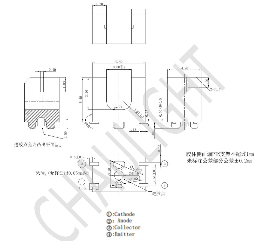 色热塑性外壳中的汇聚光轴上。光电晶体管只接收来自 IR 的辐射。这是正常